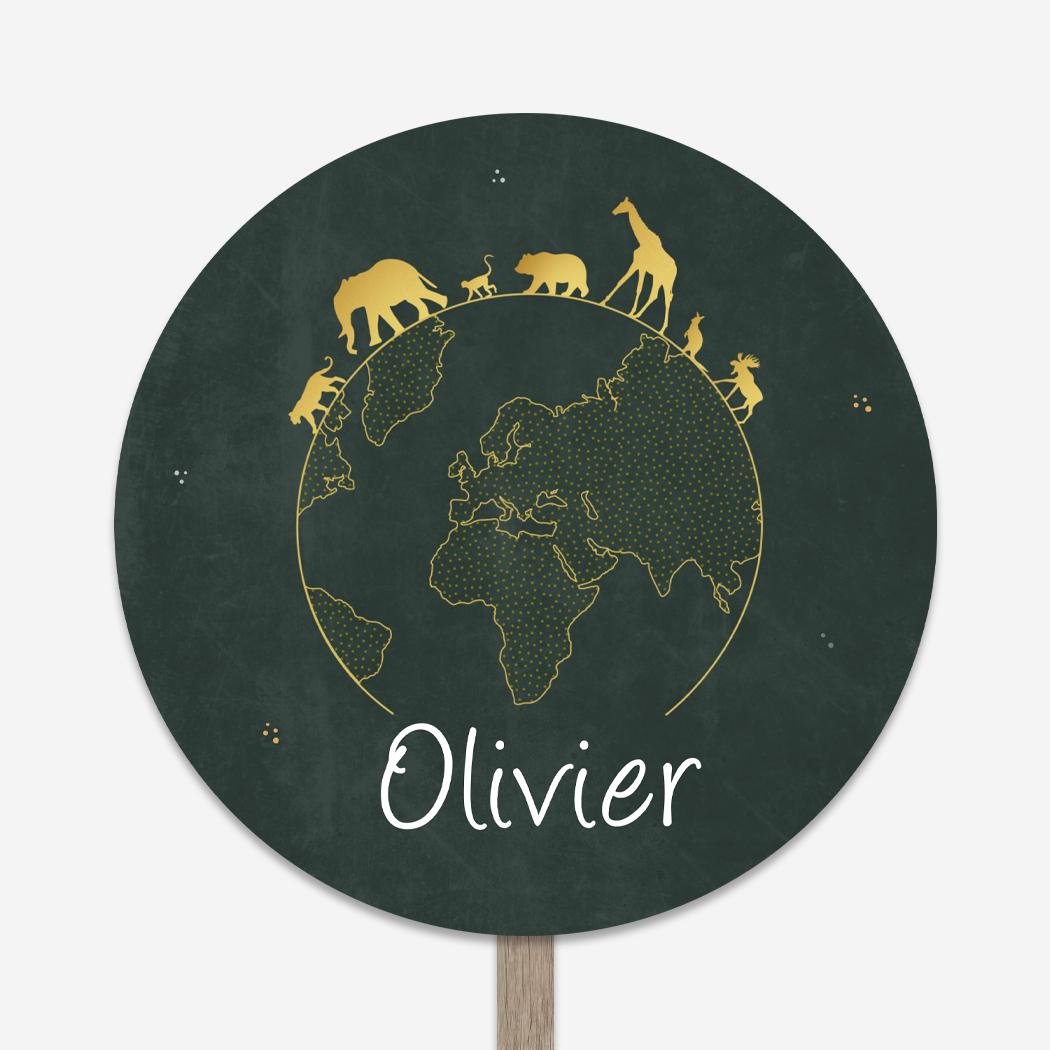 Avontuurlijk geboortebord Olivier voor in de tuin in donker groene kleur met een goudkleurige wereldbol met allerlei dieren. Het bevat een giraffe, edelhert, kangoeroe, ijsbeer, aapje, olifant en jaguar. Voor de avonturiers en wereldreizigers onder ons!