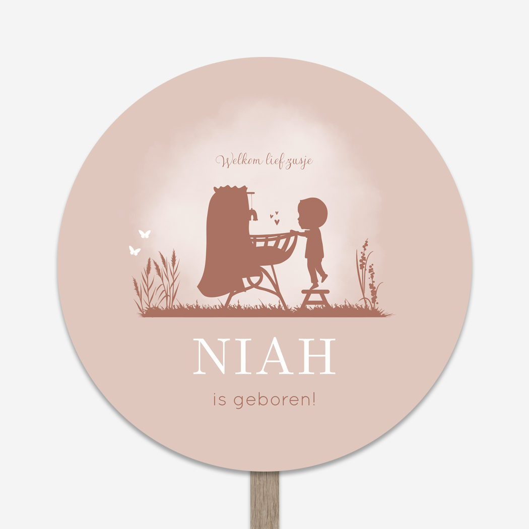 Lief zacht roze rond tuinbord Niah in de vorm van een cirkel, met een wiegje in de natuur, waar een broertje op een krukje bij staan om in de wieg naar zijn kleine zusje te kijken. Er hangt een regenboog hangertje boven het babybedje. Vlindertjes dwarrelen rondom het wiegje. Je past het ontwerp, de illustratie, de naam en kleur eenvoudig aan in onze online editor.