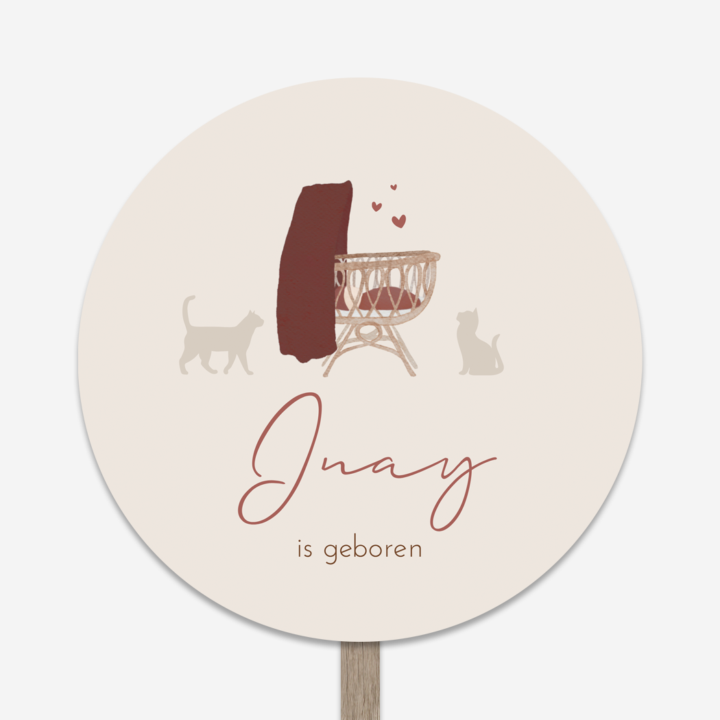Een rond geboortebord voor in de tuin in naturel tinten met roze kleuren. Op tuinbord Inay is een watercolor tekening te zien van een kleine baby in een wiegje en 2 poesjes die bij het bedje staan te kijken. Ziet jouw huisdier er anders uit? In onze beeldbank kun je veel meer soorten illustraties vinden. Er wordt géén paal bij het bord geleverd. De gaten voor de schroeven in het bord, dienen te worden voorgeboord. Zet de schroeven niet klem op het bord i.v.m. teveel spanning. Gebruik 1 of 2 palen met een platte kant, géén ronde palen! Zet de palen volledig achter het bord over de hele breedte/hoogte. Zorg dat je voldoende schroeven gebruikt om het bord vast te zetten en verdeel de schroeven over de hele breedte/lengte van het tuinbord. Bij slecht weer adviseren we om het tuinbord naar binnen te halen om schade te voorkomen.