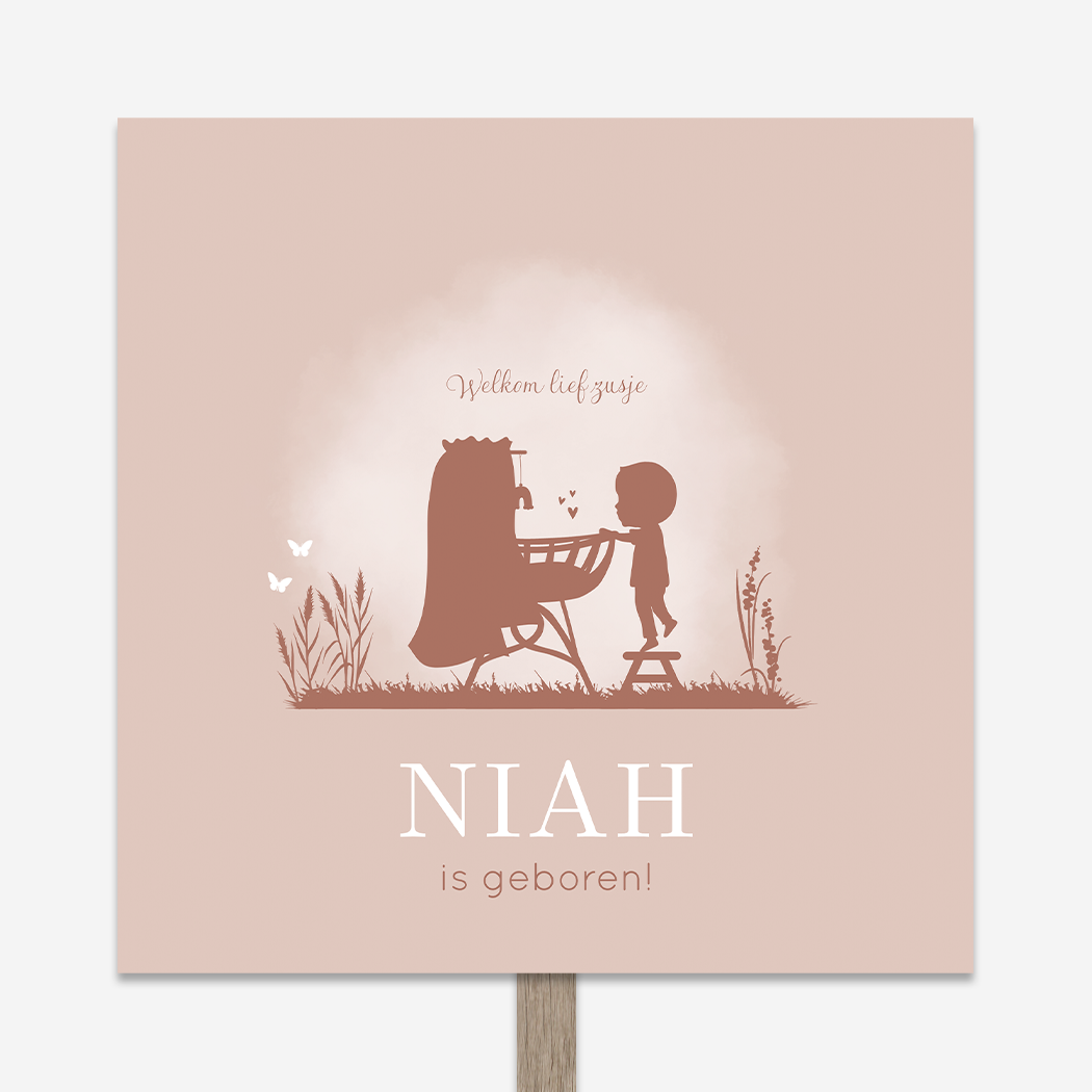 Lief zacht roze tuinbord Niah met een wiegje in de natuur, waar een broertje op een krukje bij staan om in de wieg naar zijn kleine zusje te kijken. Er hangt een regenboog hangertje boven het babybedje. Vlindertjes dwarrelen rondom het wiegje. Je past het ontwerp, de illustratie, de naam en kleur eenvoudig aan in onze online editor.