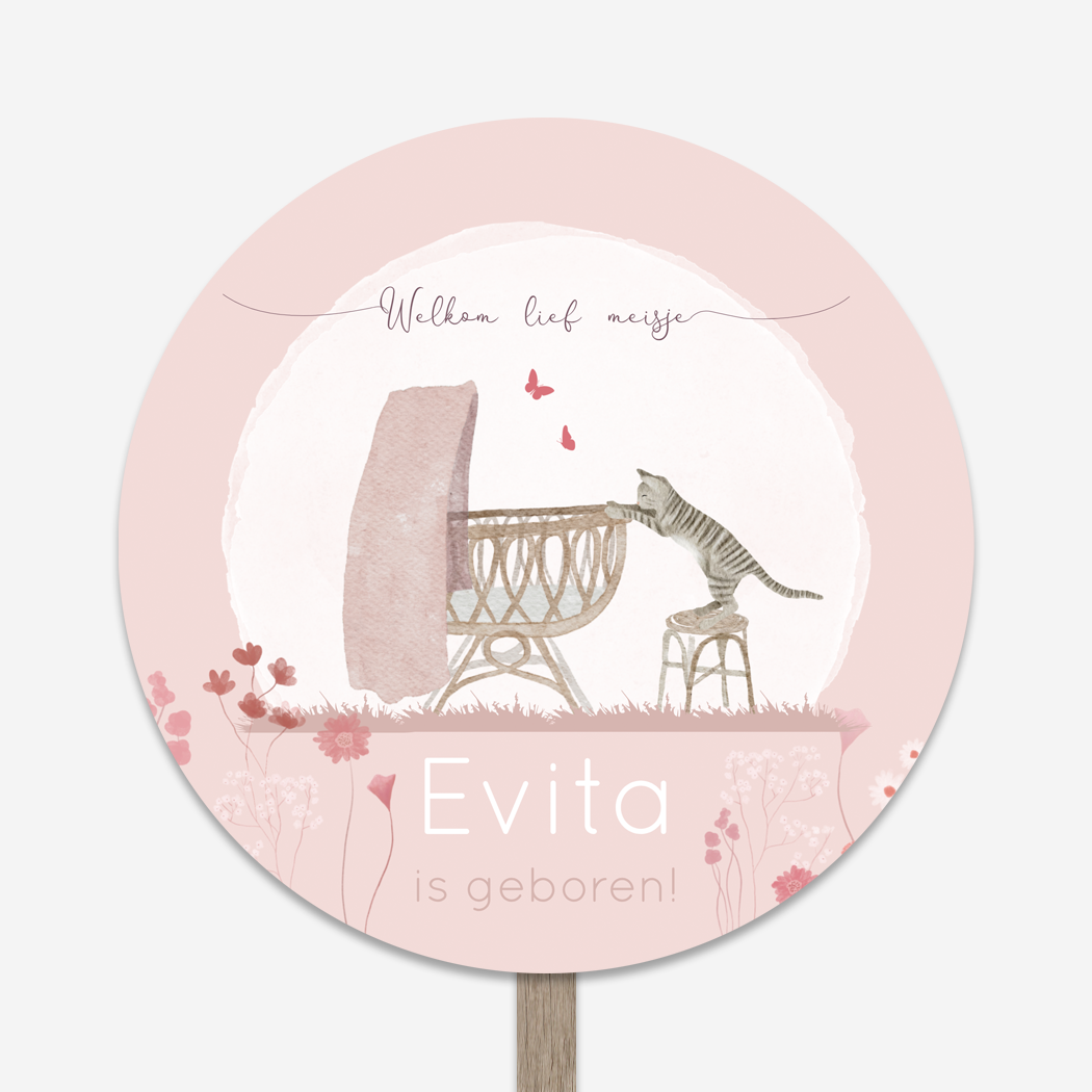 Een lief roze bloemetjes geboortebord Evita voor in de tuin met een waterverf illustratie van een poesje/kat van een kat die met zijn pootjes over het randje van de wieg kijkt om de baby te zien.. Er vliegen vlinders boven het wiegje. Tuinbord Evita kan je eenvoudig zelf aanpassen in onze editor! Er wordt géén paal bij het bord geleverd. De gaten voor de schroeven in het bord, dienen te worden voorgeboord. Zet de schroeven niet klem op het bord i.v.m. teveel spanning. Gebruik 1 of 2 palen met een platte kant, géén ronde palen! Zet de palen volledig achter het bord over de hele breedte/hoogte. Zorg dat je voldoende schroeven gebruikt om het bord vast te zetten en verdeel de schroeven over de hele breedte/lengte van het tuinbord. Bij slecht weer adviseren we om het tuinbord naar binnen te halen om schade te voorkomen.