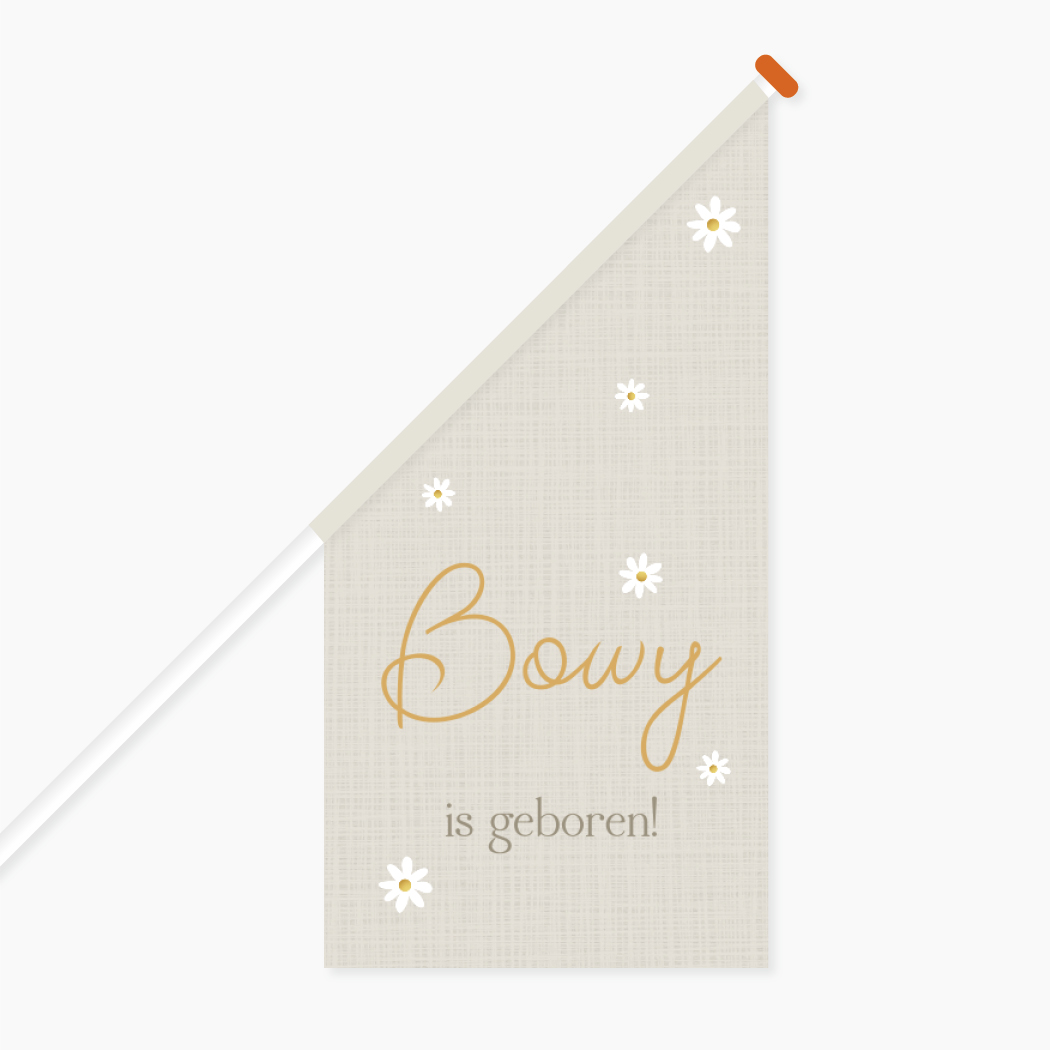 Hang de vlag uit omdat je kindje is geboren! Deze vlag Bowy heeft een beige linnenlook achtergrond en is versierd met diverse madeliefjes in verschillende groottes. De teksten zijn in goudgele kleur gedrukt.