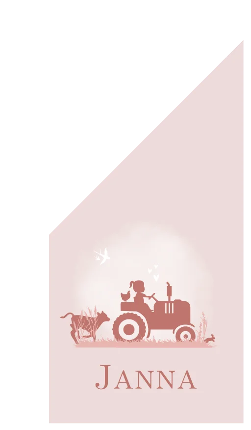 Een lichtroze geboorte vlag Janna met donkerroze met een silhouet illustratie van een meisje op een trekker/ tractor. Er rent een kalfje achter haar aan in het gras en op de trekker zit een kip die mee rijdt met het kindje en zwaluwen vliegen om ze heen. Er hupst een konijntje weg tussen het gras. Het is echt een tafereel uit het boerderijleven. Een boer zoekt vrouw vlag ;) Je past de illustraties, opmaak en kleuren helemaal zelf aan in onze online editor!
