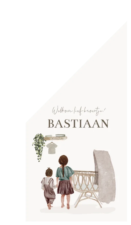 Stijlvolle geboortevlag voor aan de voorgevel van je woning met een kijkje in de babykamer. Grote zus en broer staan hand in hand bij het wiegje te kijken van hun kleine broertje Bastiaan. Het is gemaakt in waterverf stijl. Je past het ontwerp eenvoudig en snel aan in onze online editor.