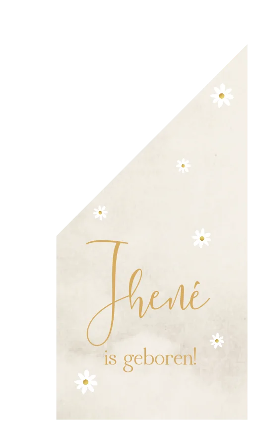 Hang de vlag uit omdat je kindje is geboren! Deze vlag Jhené is beige/ creme gewolkt van kleur met diverse madeliefjes in verschillende groottes. De teksten zijn in goudgele kleur gedrukt.