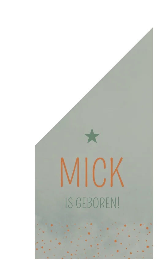 Stoere geboortevlag Mick is groen van kleur met een gewolkte groene achtergrond en een grote ster. De stippen en namen zijn in roest bruine kleur. Je past het geboorte vlag eenvoudig en snel aan in onze online editor. Tip: leuk om te geven als kraamcadeau!