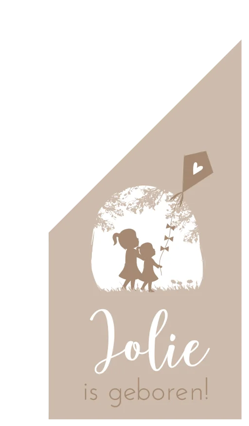 Hang de vlag uit omdat je kindje is geboren! Deze vlag Jolie is roze van kleur met 2 zusjes die samen aan het vliegeren zijn in een weide met bloemetjes. De teksten zijn in het wit en donker oudroze kleur gedrukt.