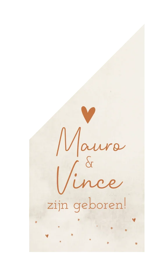 Een stoere en tijdloze beige/ crème gewolkte vlag voor een tweeling Mauro & Vince met koperkleurige hartjes en sterretjes. Je past de vlag eenvoudig en snel aan in onze online editor. Tip: leuk om te geven als kraamcadeau!