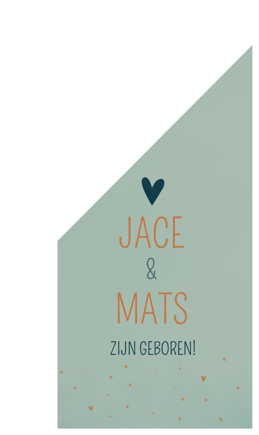 Een geboortevlag voor een tweeling met details en letters in koperkleur. Vlag Jace en Mats heeft een achtergrond met wolken en leuke sterretjes en hartjes. Je past de geboortevlag eenvoudig en snel aan in onze online editor. Tip: leuk om te geven als kraamcadeau!
