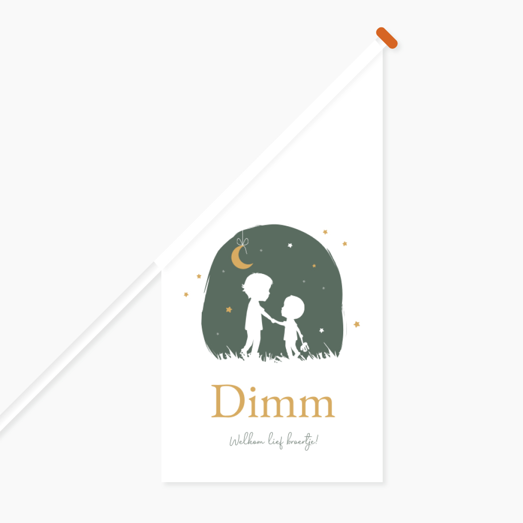 Stoere witte vlag Dimm met donkergroene kleur van een tafereel wat zich in de natuur afspeelt. Grote broer houdt zijn kleine broertje aan de hand en laat hem de nachtelijke sterren en de maan zien. De naam is in goudkleur weergegeven.