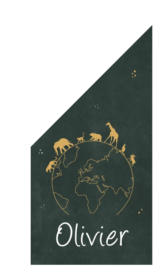 Een super hippe en stoere donkergroene vlag Olivier met een wereldbol vol met dieren, voor de kleine wereldreizigers onder ons. Op de lijntekening van de aarde zijn diverse dieren te zien zoals een panter, olifant, aapje, beer, giraffe, kangoeroe en een eland.