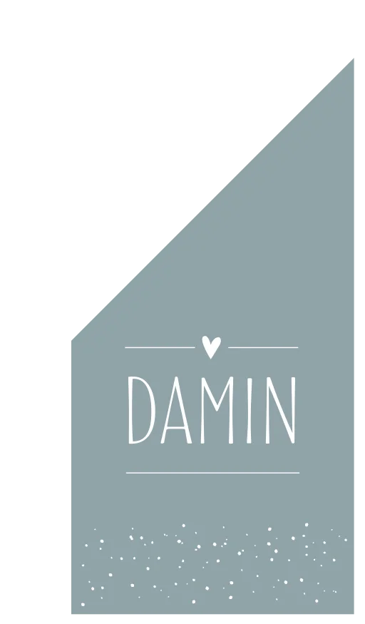 Stijlvolle oudblauwe vlag Damin met witte stipjes, klassieke letters en streepjes met een hartje als onderbreking.