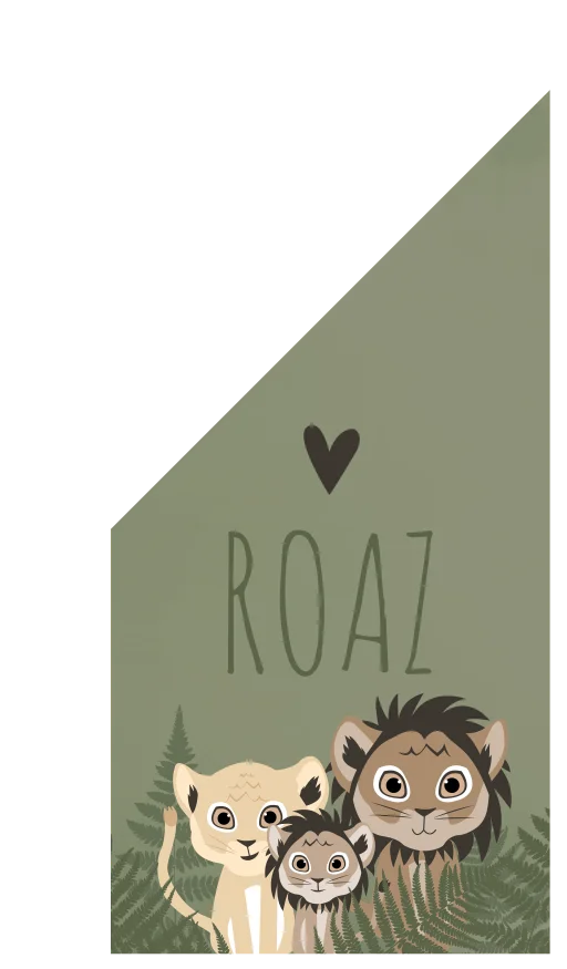Stoere donkergroene dieren vlag Roaz met een vader en moeder leeuw en een leeuwen welpje die tussen de groene bladeren zitten.