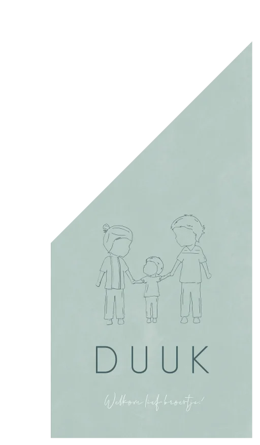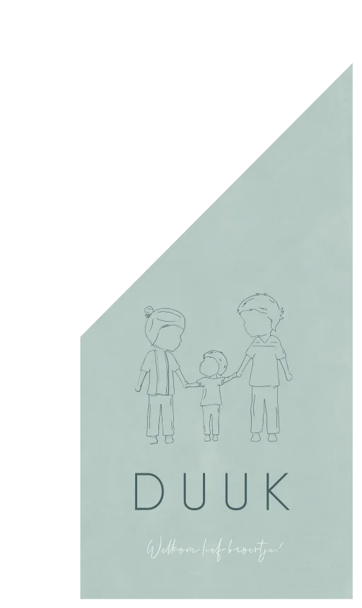 Hippe mint blauw gekleurde vlag Duuk met een mooie lijntekening er op van een grote broer en zus die hun kleine broertje aan de hand houden.