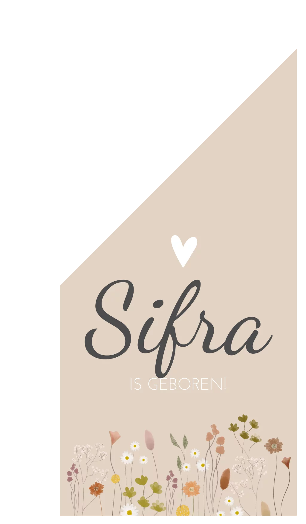 Supermooie vlag Sifra in zacht roze/ beige kleur met allerlei bloemen in verschillende kleuren. De naam is in sierlijke letters geschreven en de tekst 'is geboren' in een strak lettertype. Wil je de vlag liever aanpassen naar jouw wensen? Binnen 2 minuten is jouw vlagontwerp klaar!