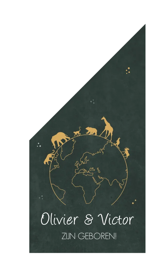 Een super hippe en stoere donkergroene vlag Olivier & Victor met een wereldbol vol met dieren, voor de kleine wereldreizigers onder ons. Op de lijntekening van de aarde zijn diverse dieren te zien zoals een panter, olifant, aapje, beer, giraffe, kangoeroe en een eland.