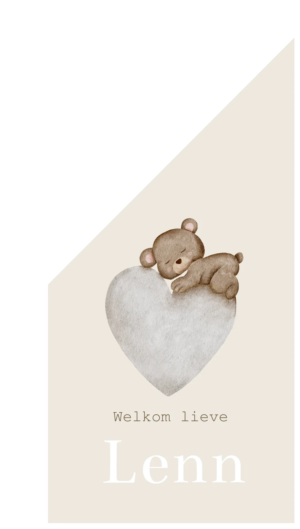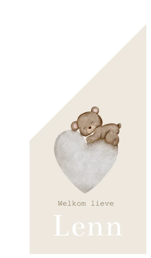 Lief, zacht en neutraal beige/crème vlag voor aan de vlaggenmast met een slapend teddy beertje op een watercolor hartje. Op geboortevlag Lenn kun je de illustratie aanpassen naar jouw wensen. In de beeldbank vind je veel mooie tekeningen waar je uit kunt kiezen. Wil je deze vlag liever in een ander kleur? Pas de kleur naar eigen wens aan in de editor.