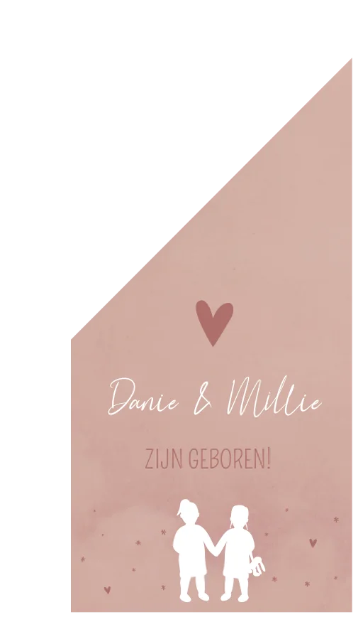 Een romantisch roze vlag met een illustratie van tweelingzusjes. Wil je graag een andere illustratie op het vlag Danie & Millie? Kijk dan even rond in onze beeldbank in de editor.