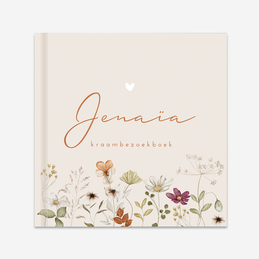 Een lief en romantisch kraambezoekboek met allerlei waterverf bloemetjes in diverse kleuren. Op invulboek Jenaïa staat de naam in een bruine kleur, dit zorgt voor een chique uitstraling. Wil je graag iets aanpassen? Neem dan een kijkje in onze editor voor de vele opties!