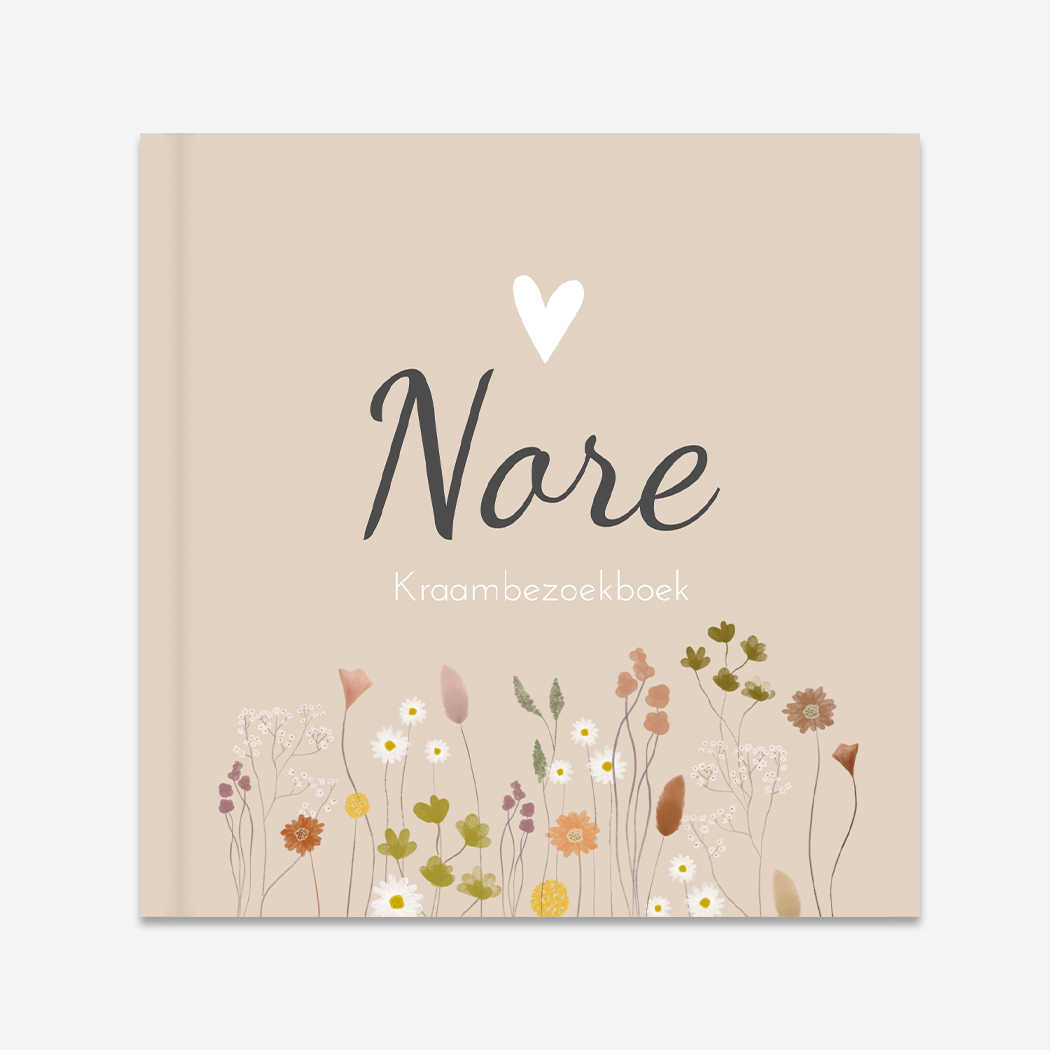 Een prachtige en stijlvol kraambezoekboek Nore met beige kaft en bloemetjes opdruk. Je past hem helemaal zelf aaneen de online editor!