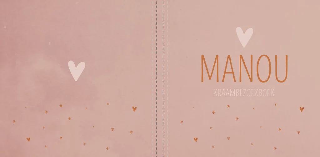 Supermooi gewolkt roze kraambezoekboek Manou met koperkleurige hartjes en sterretjes. Je past hem eenvoudig en snel aan in onze online editor!