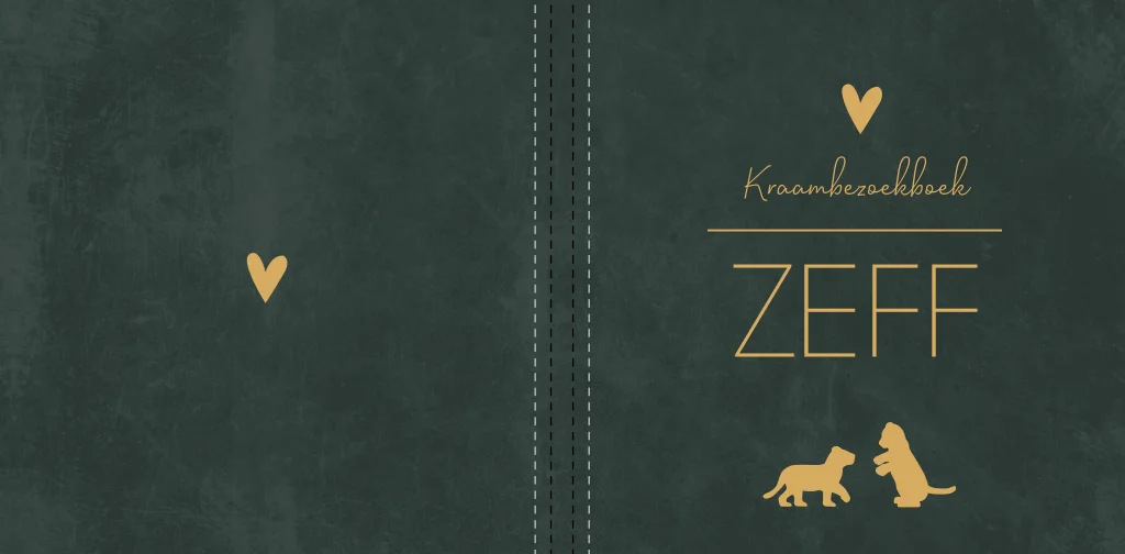 Stoer donkergroen kraambezoekboek Zeff in velvetlook met twee leeuwenwelpjes die met elkaar spelen.