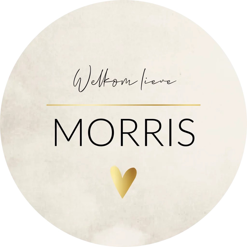 Hip en trendy ronde sticker Morris voor op het raam met beige gewolkte achtergrond, goudkleurig hartje en zwarte letters. (let op; geen goudfolie!) Je past hem eenvoudig zelf aan in onze online editor!