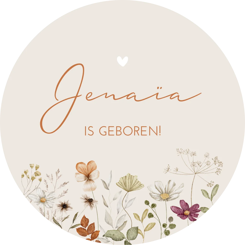 Een lieve en romantische sticker voor op het raam met allerlei waterverf bloemetjes in diverse kleuren. Op raamsticker Jenaïa staat de naam in een chique bruine kleur. Wil je graag iets aanpassen? Neem dan een kijkje in onze editor voor de vele opties!