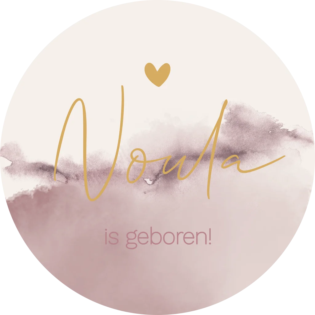 Warm, stijlvol, tijdloos en dromerige raamsticker Noula met beige/ crème achtergrond en oud roze wolkjes in watercolor effect. De naam springt er uit in goudkleur. Je kunt deze sticker voor op het raam volledig zelf aanpassen in onze online editor.