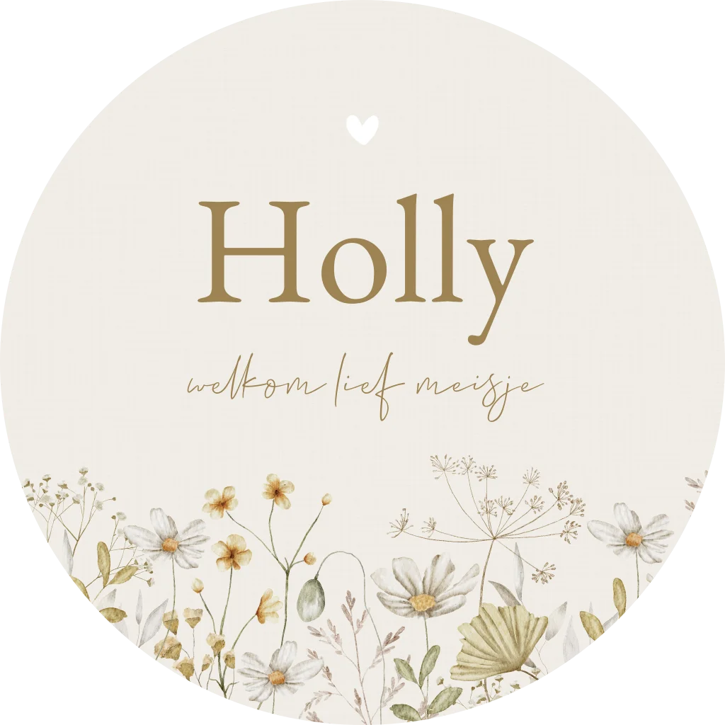 Een romantische raamsticker met een waterverf/aquarel illustratie van verschillende veldbloemen. Op de achtergrond zit een heel licht linnen effect. Raamsticker Holly heeft een rustige uitstraling door het gebruik van één kleurenfamilie en wordt door het gebruik van klassieke lettertypes een tijdloos ontwerp. Wil je graag iets aanpassen? Neem dan een kijkje in de editor voor de vele opties!