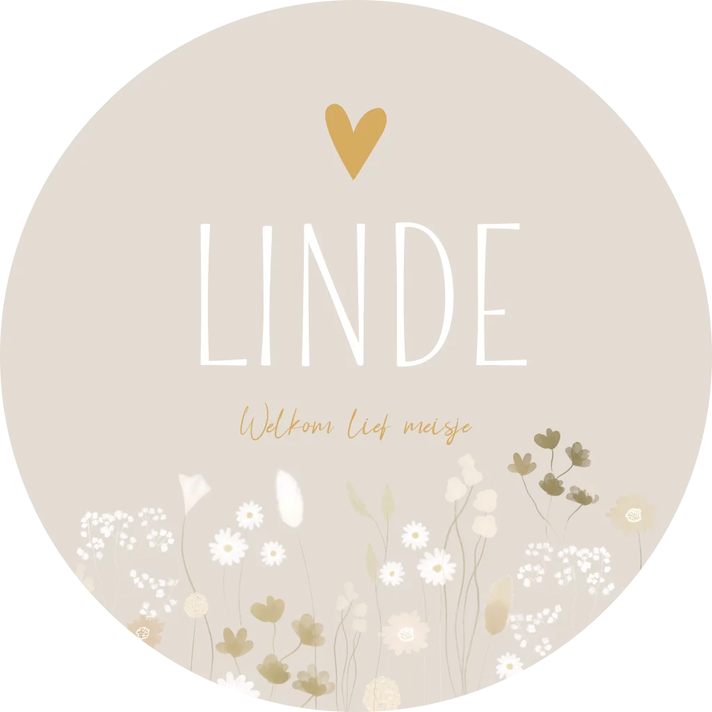 Sticker Linde is een hip beige/ creme ronde raamsticker met allerlei droogbloemen/ bloemetjes in diverse nude lichte kleuren. Het hartje is in goudlook en de naam in het wit, dit kun je volledig zelf aanpassen in de editor!