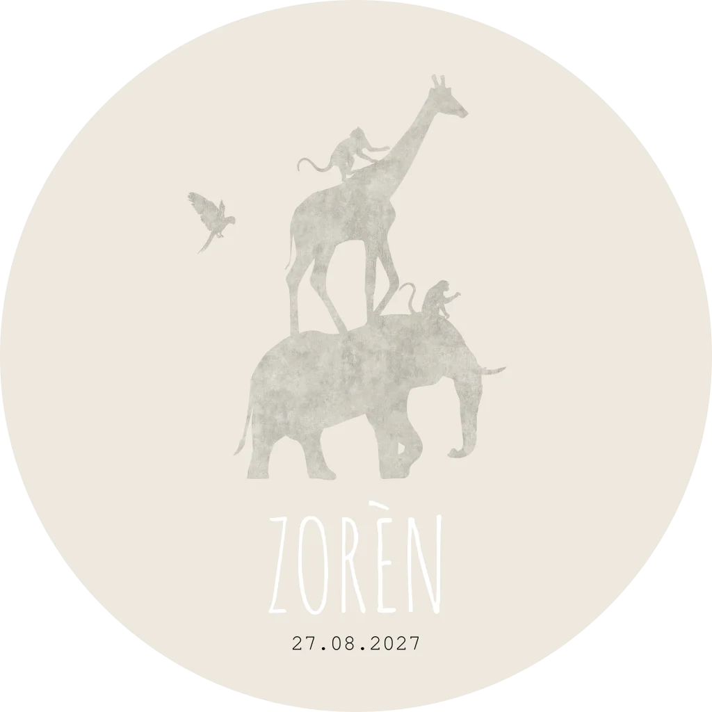 Sticker Zorèn is een beige ronde raamsticker met safari dieren zoals een olifant, giraffe, aapjes en een papegaai.