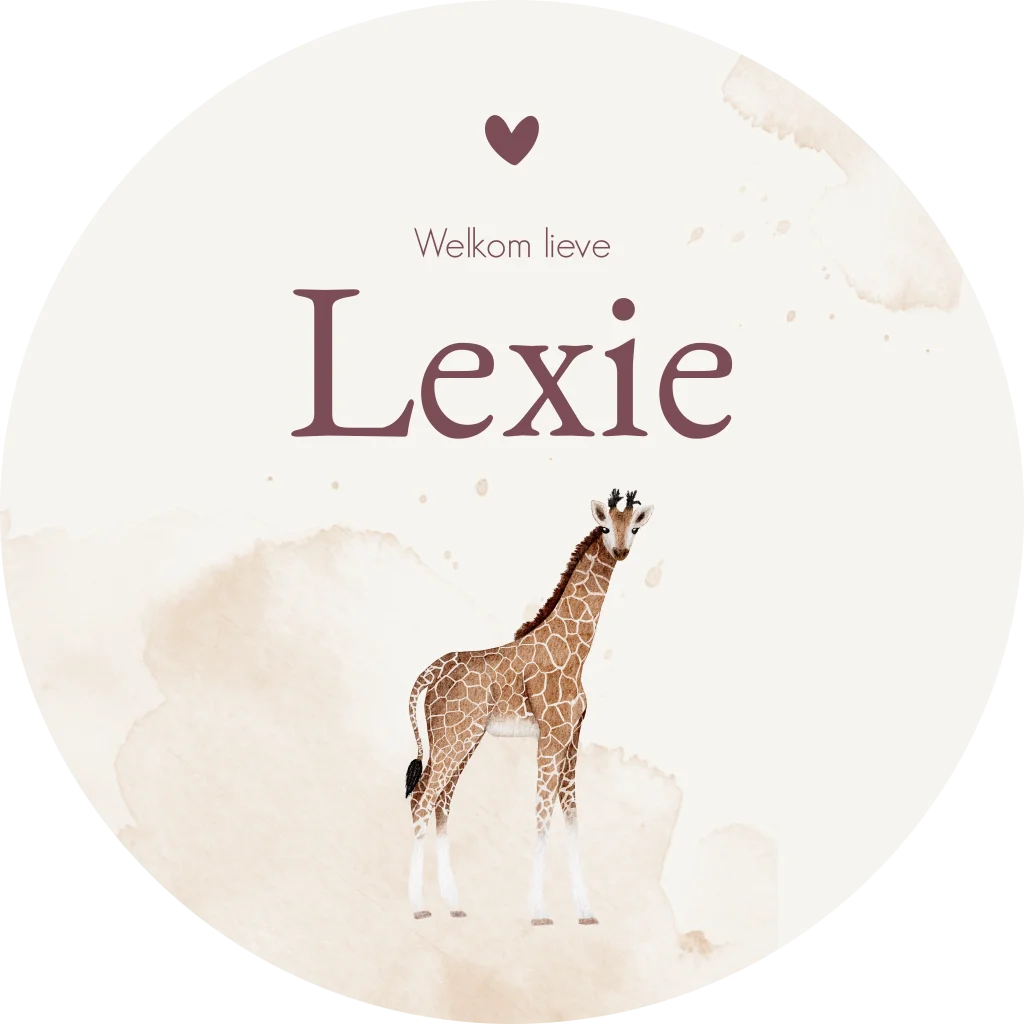 Een beige/crème raamsticker Lexie met waterverf vlekken en een giraffe illustratie. Je kunt de sticker eenvoudig zelf aanpassen in onze online editor!