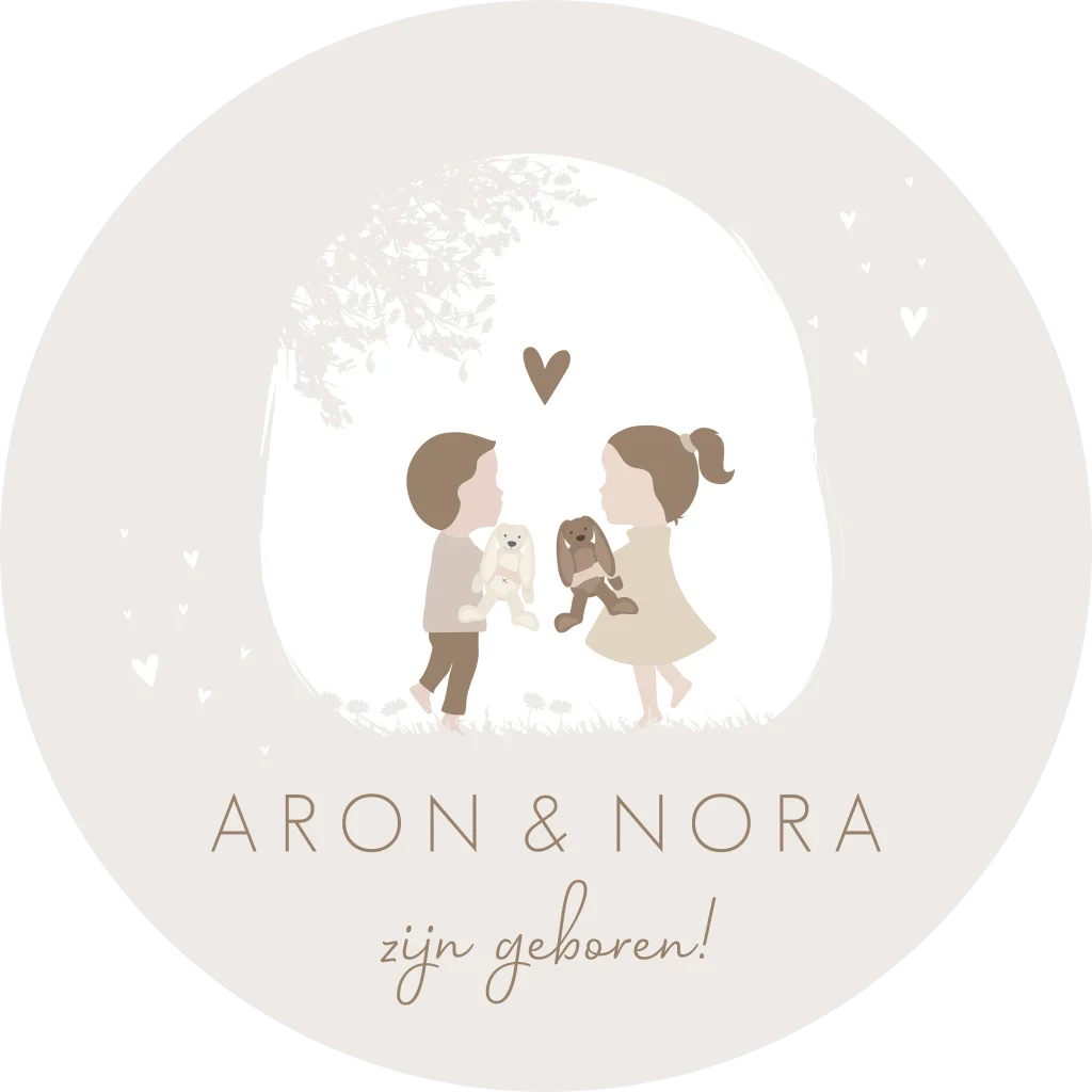 Super schattige beige ronde raamsticker voor een tweeling. In een illustratief thema met Happy Horse knuffels. Het broertje en zusje hebben allebei een nieuwe knuffel gekregen wat hun lievelingsknuffels is.