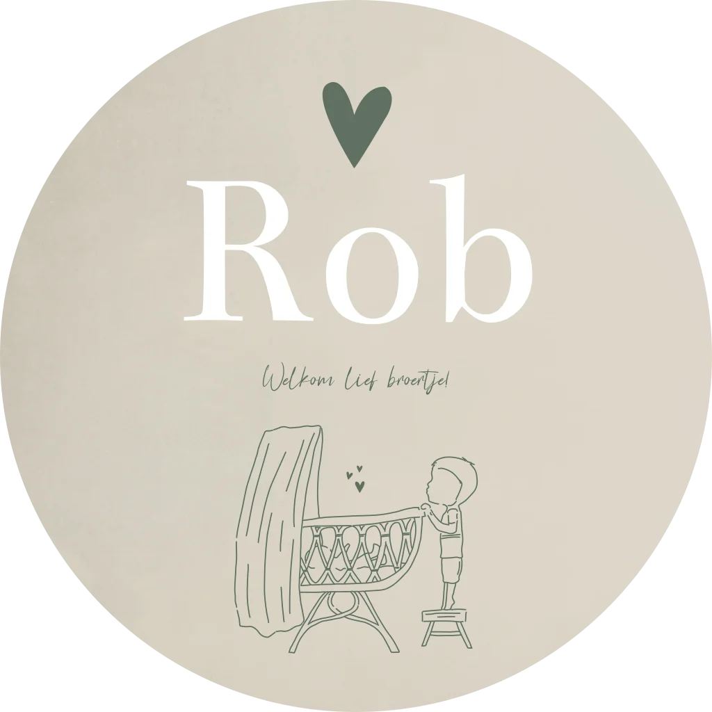 Beige/ creme raamsticker met een groene lijntekening van een broertje die op zijn teentjes over het randje van de wieg kijkt om zijn lieve kleine baby broertje te kunnen zien. De liefde spat er vanaf in de vorm van hartjes boven het wiegje. Je kunt raamsticker Rob naar eigen wens aanpassen in de editor.