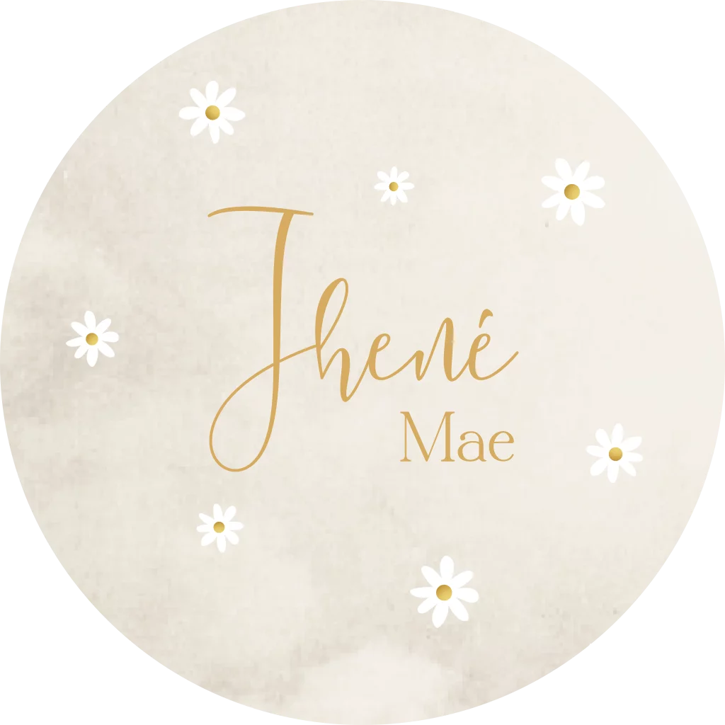 Een vrolijk beige/ crème ronde raamsticker met allemaal margriet bloemetjes. De naam is in sierlijke letters weergegeven. Je kunt raamsticker Jhené eenvoudig aanpassen in de editor.