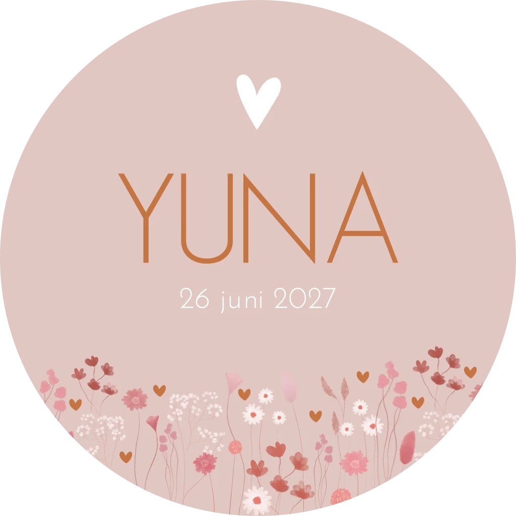 Beige/ crème raamsticker Yuna met allemaal bloemetjes in diverse kleuren en de naam in sierlijke letters en een wit hartje.