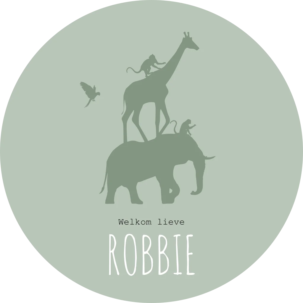 Stoere rond groene safari raamsticker met een olifant, giraffe, aapjes en een toekan.