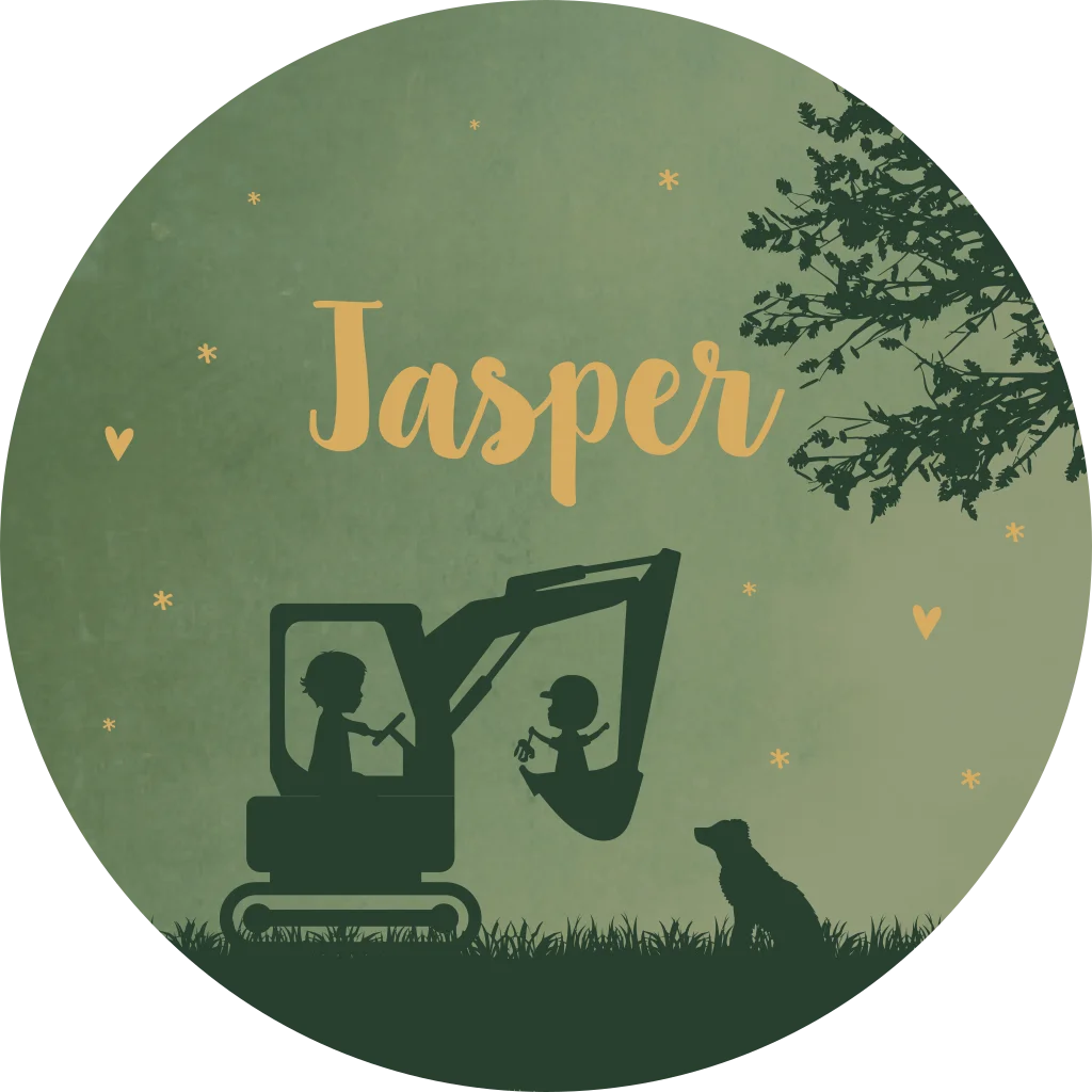 Groen gewolkte ronde sticker Jasper met een illustratie van een jongetje in een graafmachine en een silhouet tekening van een broertje en een hondje.