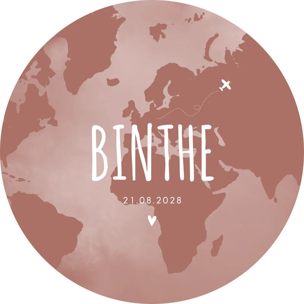 Een avontuurlijke roze ronde raamsticker Binthe voor een wereldreiziger. De sticker heeft de vorm van een wereldbol en er is een vliegtuigje op de sticker geplaatst om te laten zien dat het een reislustig kindje zal worden. Gaan jullie samen nieuwe avonturen beleven?