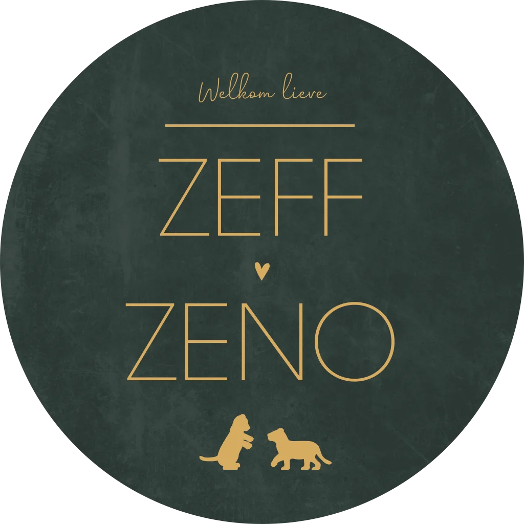 Een stoer donkergroen raamsticker Zeff en Zeno met twee spelende leeuwtjes/welpjes in goudkleur. De groene trendkleur op deze sticker is ontzettend mooi in combinatie met het strakke ontwerp. Heb je liever ander dieren op het ontwerp? Dat kan! Neem een kijkje in onze beeldbank voor alle opties.