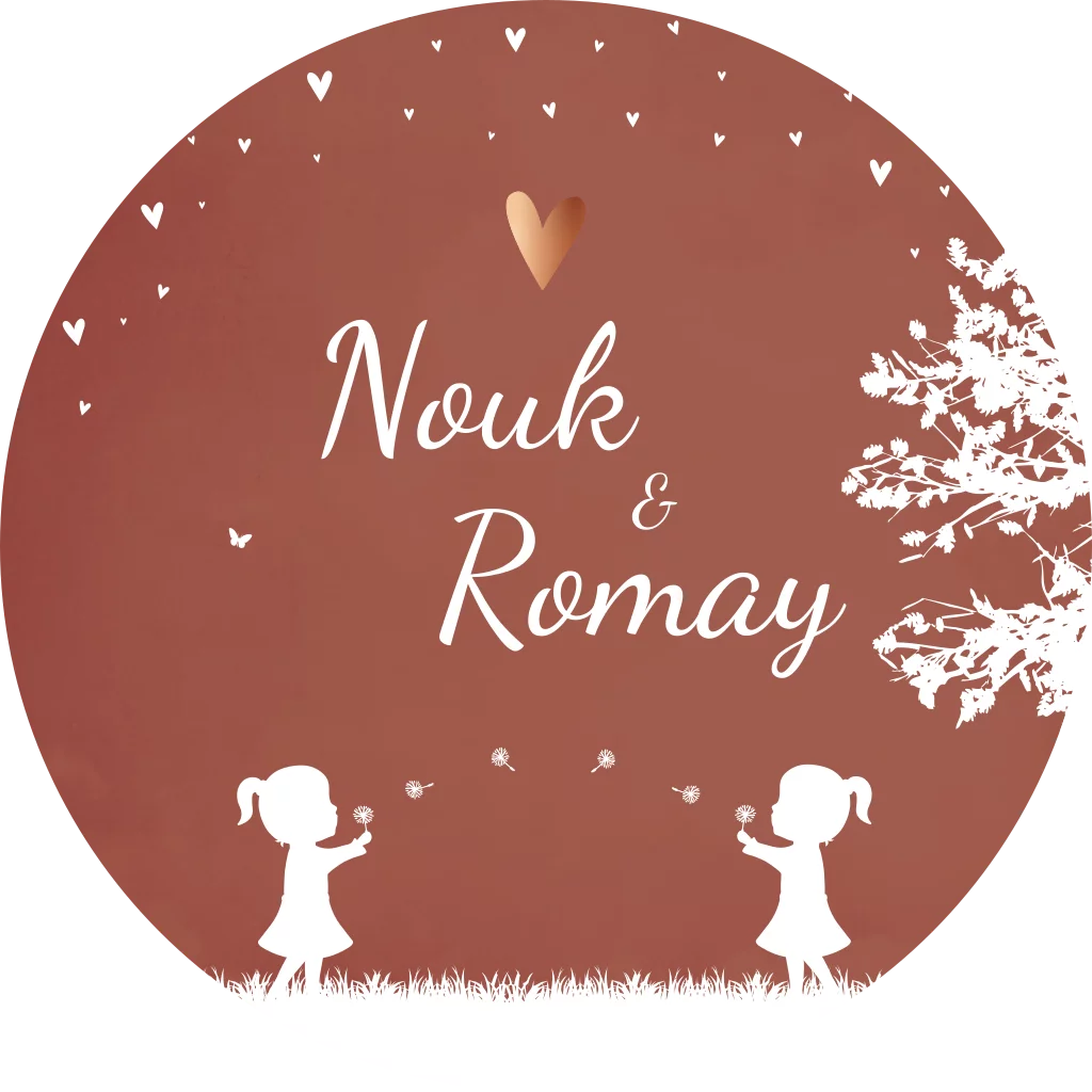 Een roestbruin bordeaux rode raamsticker met twee meisjes die paardenbloemen naar elkaar blazen. Naast de tweeling staat een boom. Raamsticker Nouk & Romay is een illustratie ontwerp waarbij je de illustraties eenvoudig zelf kunt aanpassen in de editor. Zo kan je bijvoorbeeld je huisdieren of eventuele oudere kindjes toevoegen. Kom je er zelf niet uit? Neem gerust contact met ons op, we helpen je graag.