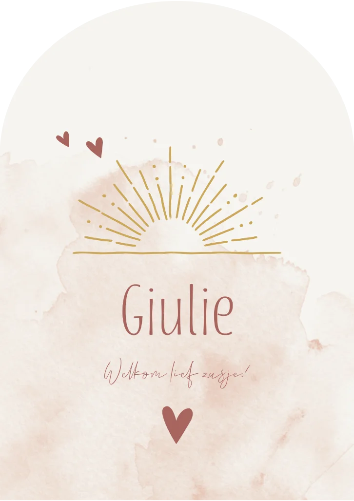 Een hip geboortekaartje in een halfronde stansvorm. Op kaartje Guilie is een beige/roze achtergrond gecombineerd met een illustratie van een opkomende zon en hartjes.