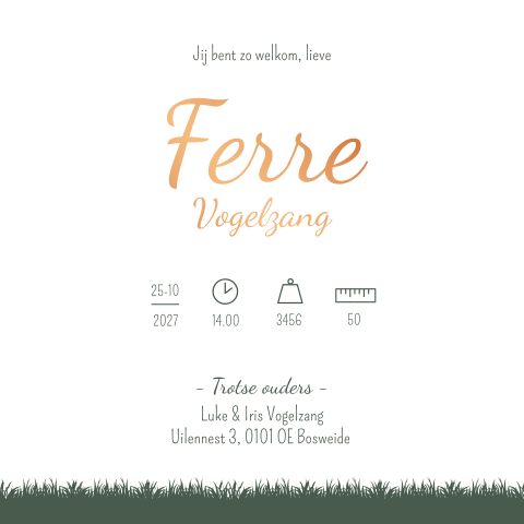 Zelf een geboortekaartje maken? Ontwerp het geboortekaartje van jouw zoon dan in onze ontwerptool. Kies een blanco kaart formaat en maak het geboortekaartje helemaal zelf. Wist je dat je ook heel eenvoudig een geboortekaartje jongen uit onze collectie kunt aanpassen? Kies een ontwerp, open deze in de editor en maak het jongens geboortekaartje helemaal naar jouw wensen. Bestel vervolgens een proefdruk van het kaartje. Je kunt dan thuis op je gemak de kaart bekijken en zo weet je zeker dat je de juiste keuze maakt bij het aankondigen van de geboorte van jullie meisje.
