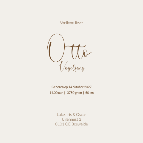 De geboorte van een jongen is een bijzonder moment in het leven van kersverse ouders. Het is de eerste keer dat je de komst van je kleine prins aan de wereld aankondigt. Bij Het Uilennestje begrijpen we hoe belangrijk dit is. Daarom bieden we een uitgebreide collectie unieke en hippe geboortekaartjes voor jongens. Of je nu houdt van klassiek blauw, stoer terracotta of trendy beige, wij hebben voor elk wat wils. Onze kaartjes zijn niet zomaar kaartjes; ze zijn kleine kunstwerkjes die de persoonlijkheid van jouw zoon weerspiegelen. Van schattige dierenthema's tot stijlvolle waterverftekeningen, elk ontwerp is met zorg samengesteld om jouw blijde nieuws op de mooiste manier te verkondigen.