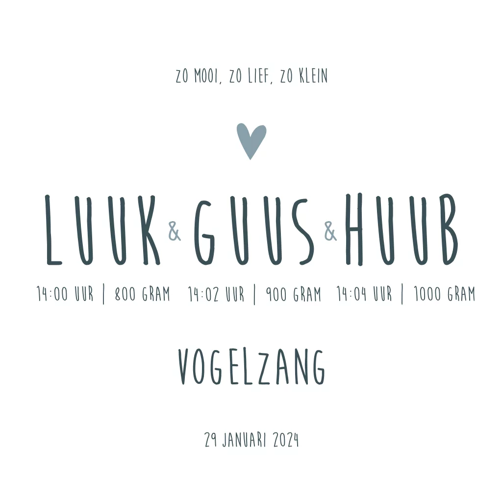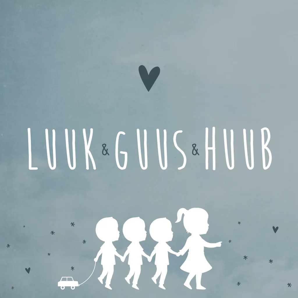 Een lief blauw geboortekaartje met een illustratie van een grote zus met drie broertjes die hand in hand lopen. De drieling broertjes lopen achter hun grote zus Suus aan en een jongetje heeft een speelgoed auto in zijn hand. Wil je graag een andere illustratie op kaartje Luuk, Guus & Huub? Kijk dan even rond in onze beeldbank in de editor.