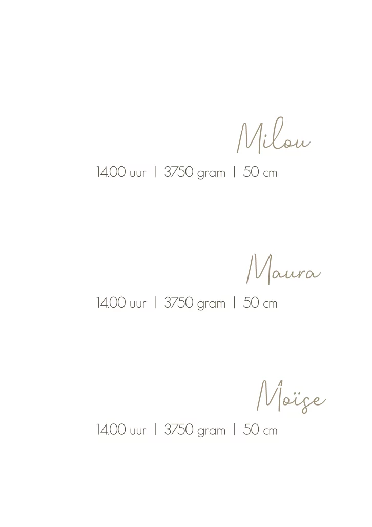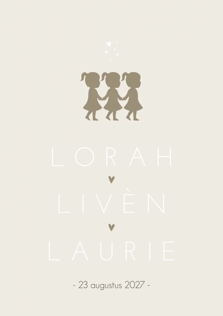 Stijlvol en neutraal geboorte kaartje voor een drieling. De naam is in koperfolie gezet, deze kun je gemakkelijk zelf aanpassen naar een andere kleur. Je past hem volledig zelf aan in onze editor! Kaartnaam: Lorah, Livèn en Laurie.