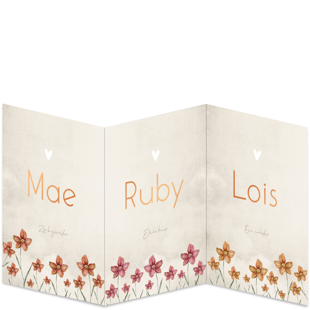 Een beige geboortekaartje als 3-luik kaartje. Op het kaartje staan bloemen in verschillende kleuren en een mooiste tekst. Kaartje Mae, Ruby en Lois is een vrolijk bloemenkaartje voor een meisjes drieling. Wil je graag iets aanpassen? Neem dan een kijkje in onze editor!