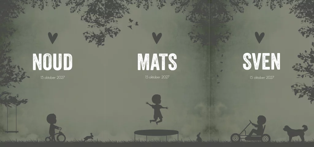 Een gewolkt groen geboortekaartje als 3-luik kaartje. Op het kaartje staan 3 jongetjes omringd door verschillende diertjes. Een jongen fietst op een loopfietsje, een andere springt op een trampoline en het derde jongetje rijdt op een skelter. Kaartje Noud, Mats en Sven is een stoer kaartje voor een drieling. Wil je graag iets aanpassen? Neem dan een kijkje in onze editor!