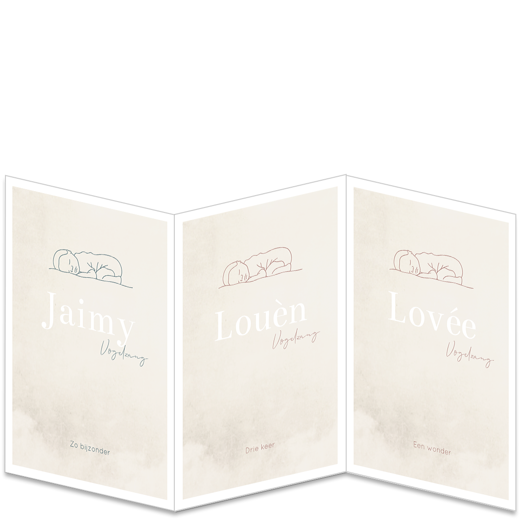 Een prachtig beige/ crème luikkaartje/ zigzagkaartje voor een drieling. Op de voorzijde staan van de drie kindjes een lijntekening op een beige gewolkte achtergrond. De achterzijde is neutraal en klassiek, daardoor is kaartje Jaimy, Louèn en Lovée een tijdloos ontwerp.